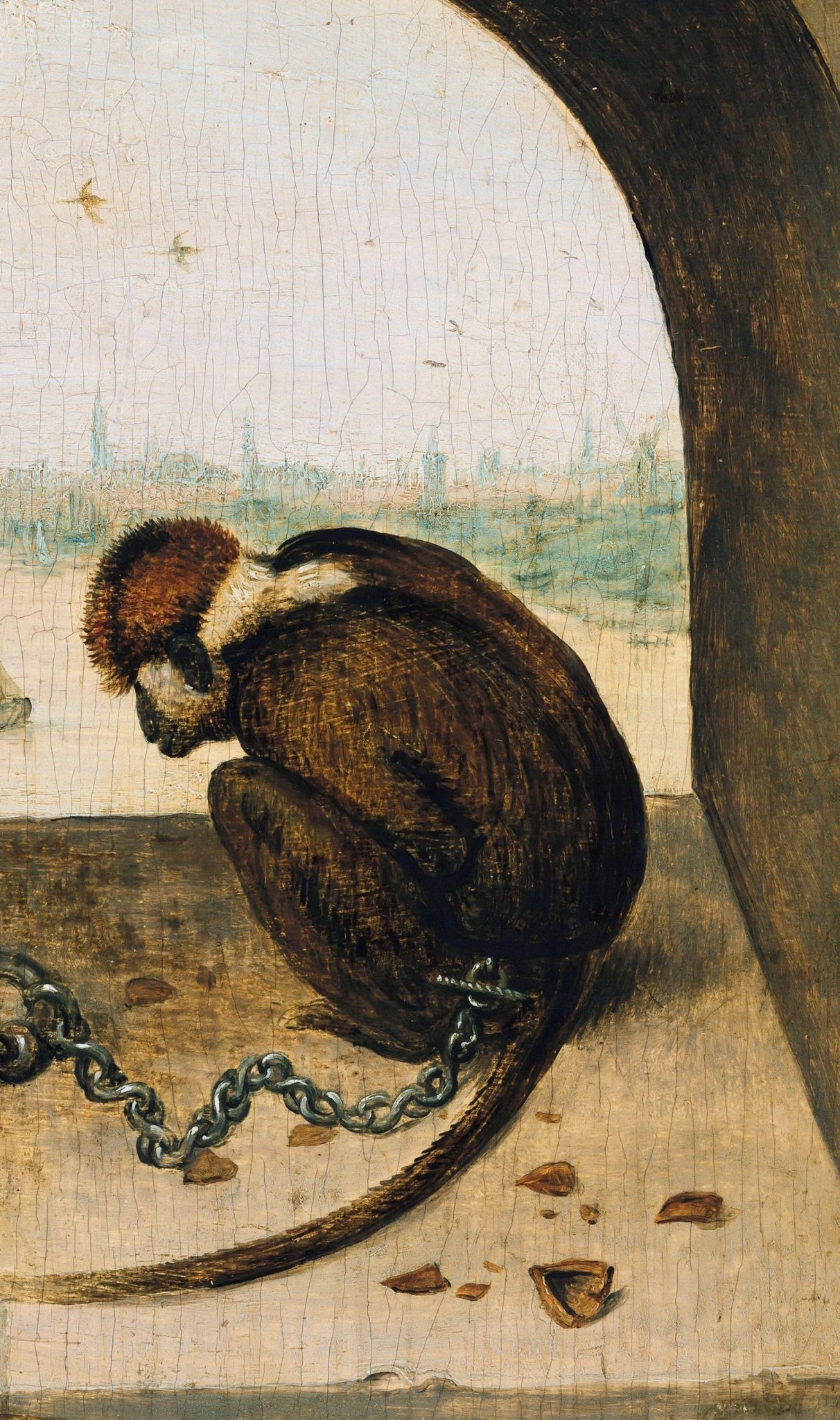 В 1562 г. Брейгель пишет небольшую картину «Две обезьяны на цепи». На переднем плане изображены две обезьяны, сидящие на цепи в проёме низкого сводчатого окна. Обезьяна — это символ греха, низменных инстинктов: бесстыдства, похоти. Здесь представлены и другие символы греха, которые легко угадывались современниками Брейгеля. Я имею в виду ореховую скорлупу — известный для нас мотив плотского греха, греха похоти, сладострастия. Таким образом, грех посажен на цепь.