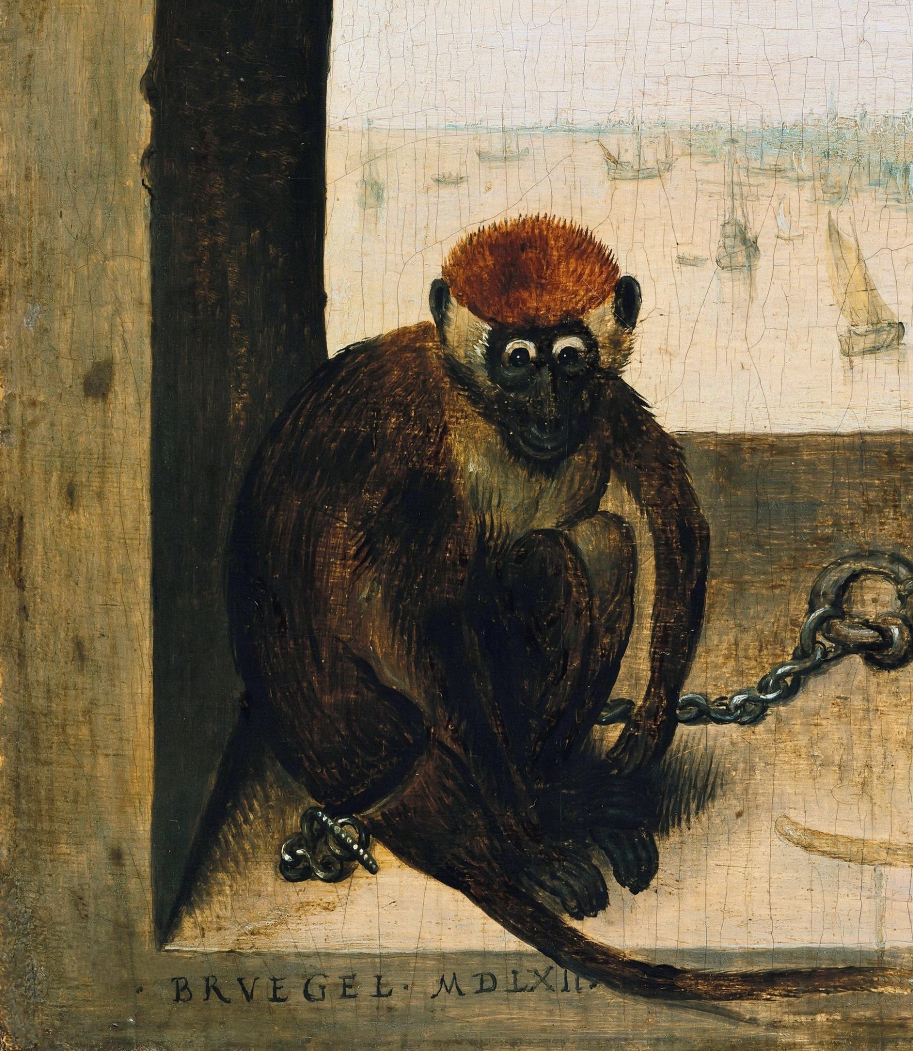 О том, что это картина нашего внутреннего мира, говорит выразительный взгляд обезьянки, находящейся ближе к нам. Мы встречаемся с этим взглядом. Возникает немой диалог. Две обезьянки скованы одной цепью. Может быть, это метафора греха, посажанного на цепь? Обычная для Брейгеля злая дидактика в религиозном духе? Но почему же тогда обезьянки вызывают в нас живое сочувствие? Их хвостики тянутся друг к другу. Они являют собой одно целое. Создаётся впечатление возникшего единства, нашей близости с этими жалкими существами. Нам кажется, что это одна и та же обезьянка, только показанная в разных ракурсах. Как в кинематографе съёмка с разных ракурсов драматизирует изображение, выявляет внутренний конфликт. Это зафиксированное внутреннее движение нашей скованной обстоятельствами, борьбой за выживание души.