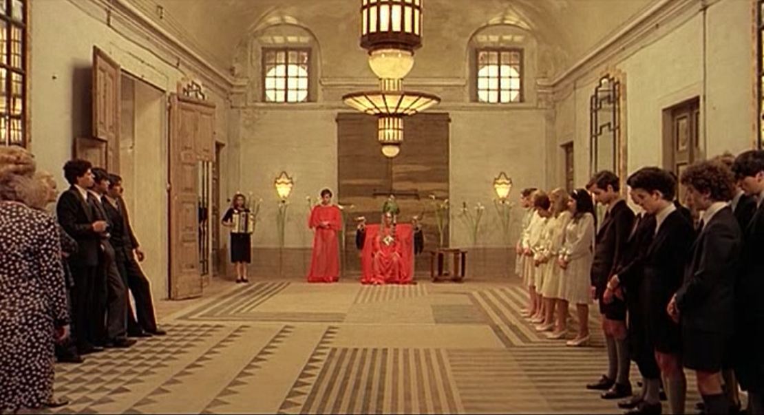 В «Круге крови» правители республики Сало, поочерёдно меняясь, участвуют в пытках и наблюдают за ними. Таким образом они возбуждаются и получают удовлетворение. При этом звучат стихи Эзры Паунда и музыка Карла Орфа — творцов, которые сотрудничали с нацистами. Здесь содержится упрёк художникам, которых сманила «тёмная сторона» фашизма.