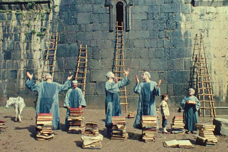 Во-первых, в «Цвете граната» отсутствует динамическая камера. Действие персонажей (если это можно назвать действием – об этом далее) происходит внутри неподвижного кадра. Операторская работа в данном случае сведена на ноль, камера абсолютно статична. Параджанов как-то признался, что намертво зафиксировал камеру «в пику» оператору Юрию Ильенко, с которым часто спорил (был даже вызов на дуэль), когда работал над прошлым фильмом.