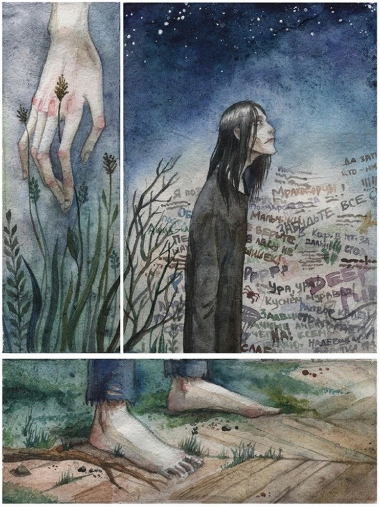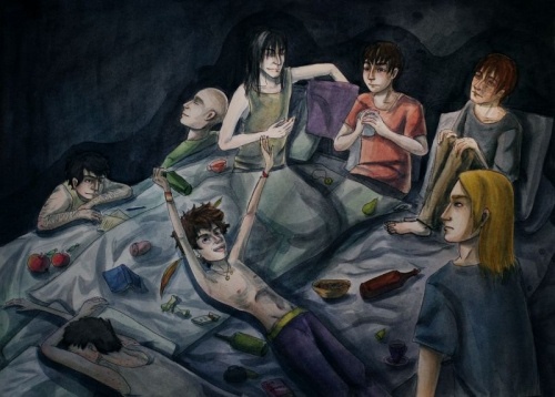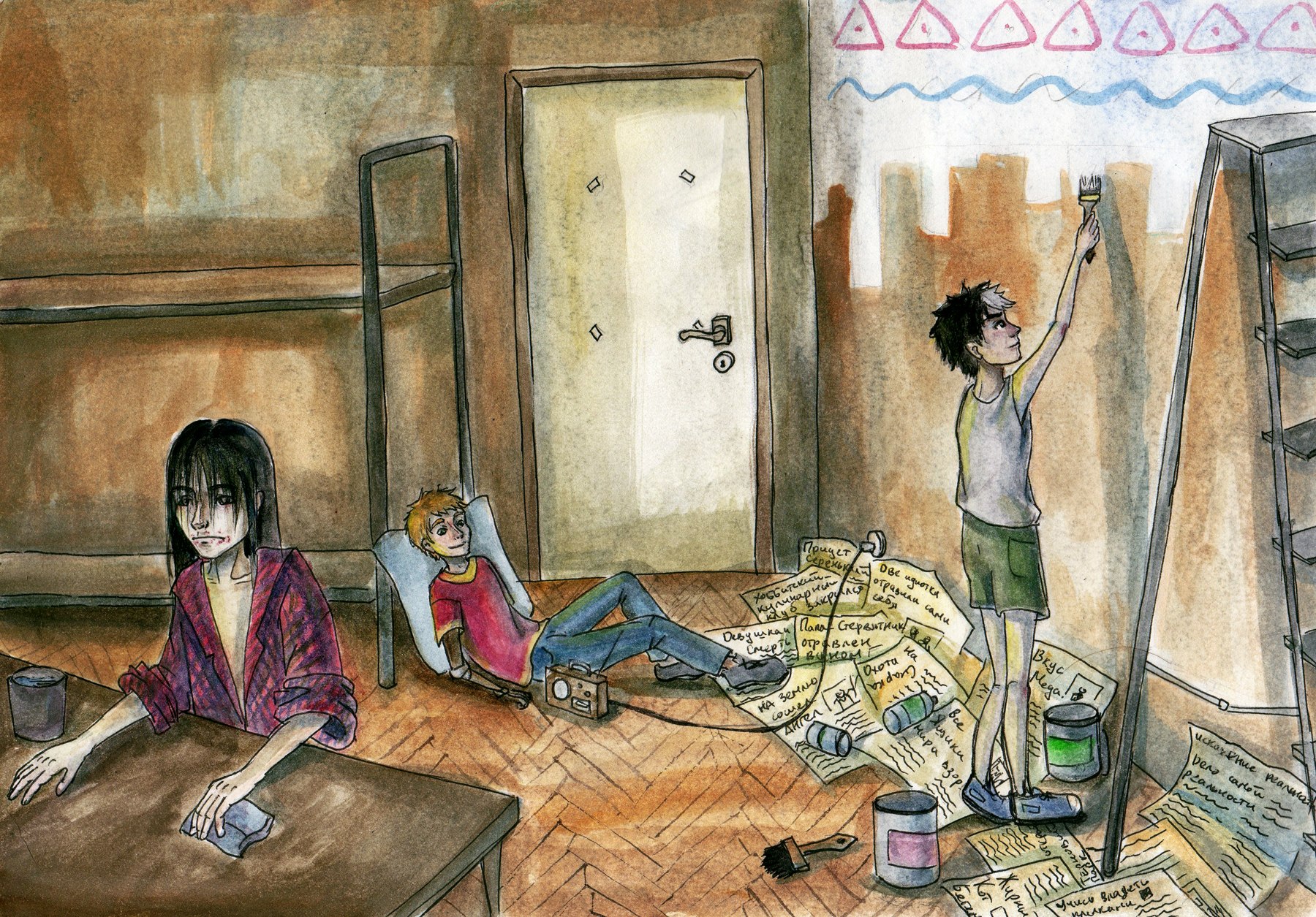 В результате мы получаем великолепно прописанных персонажей. То же самое с обстановкой Дома. Как будто оказываешься в одной спальне с героями, лежишь на общей гигантской кровати, закутавшись в одеяло, ощущаешь его тепло. Отчётливо слышишь запахи благовоний и душераздирающее соло Джимми Пейджа из магнитофона. Вокруг кипит жизнь состайников. Неходячий, но похожий на молодого Боуи колясник Лорд, взбирается на подоконник с ловкостью акробата. Вожак дома — Слепой, — бледный, словно призрак, неслышно уходит в темноту ночных коридоров. Услужливый Македонский заваривает ароматный кофе, звенит мокрыми, только что вымытыми чашками. Табаки копается в громадной куче хлама, которая заполонила полкомнаты.