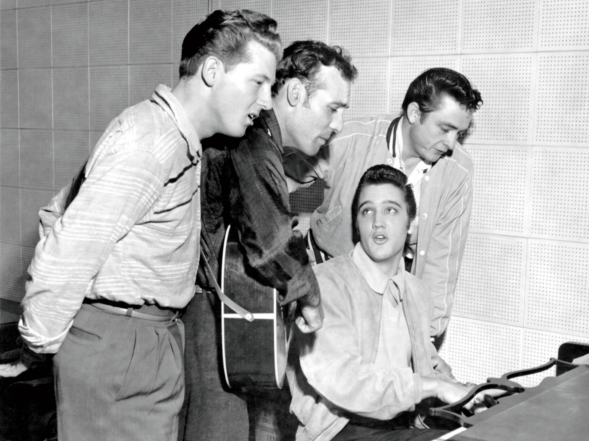 «Джерри Ли Льюис, Карл Перкинс (ещё один известный «выпускник» Sun Records), Элвис Пресли и Джонни Кэш. 1956 год»