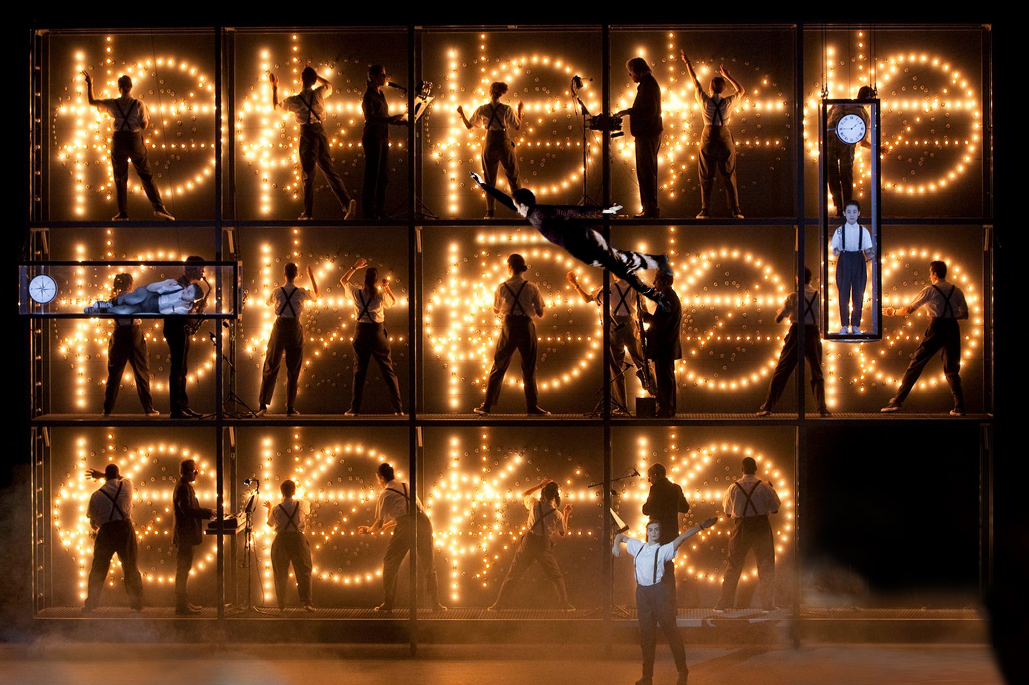 Её не стоит воспринимать как оперу в привычном понимании. Здесь многое от жанра перформанса, а сюжет состоит из 20 связанных между собой сцен, которые поделены пятью «пьесами на коленях». Последние одновременно отсылают к жанру интермеццо (раньше звучавшая в опере) и собственно к самой соединительной функцией коленей.