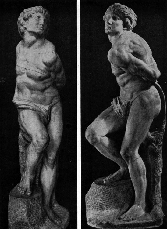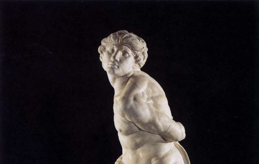 Взгляните на его рабов. Их души будто рвутся к призрачному царству истины и беспредельной свободы. И здесь только два направления вместо четырех: одно — для верхней части, другое, в противоположную сторону, — для нижней. Колени согнуты, тяжесть тела распределяется на обе ноги, но нет конкретики, а следовательно нет и состояния покоя. Бедро той ноги, на которую приходится меньше тяжести поднято и выделяется, как будто вес тела сейчас будет перенесен на нее.