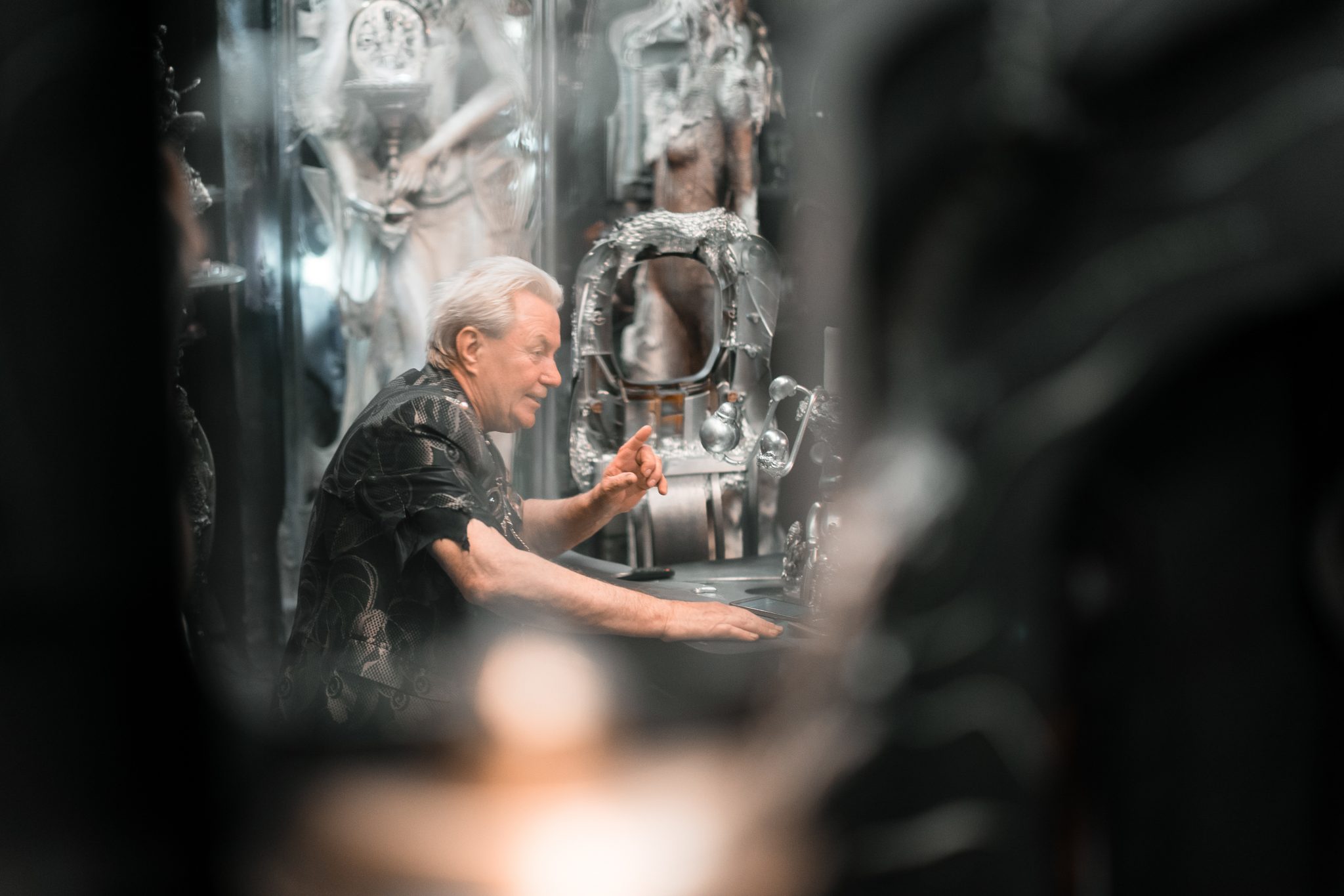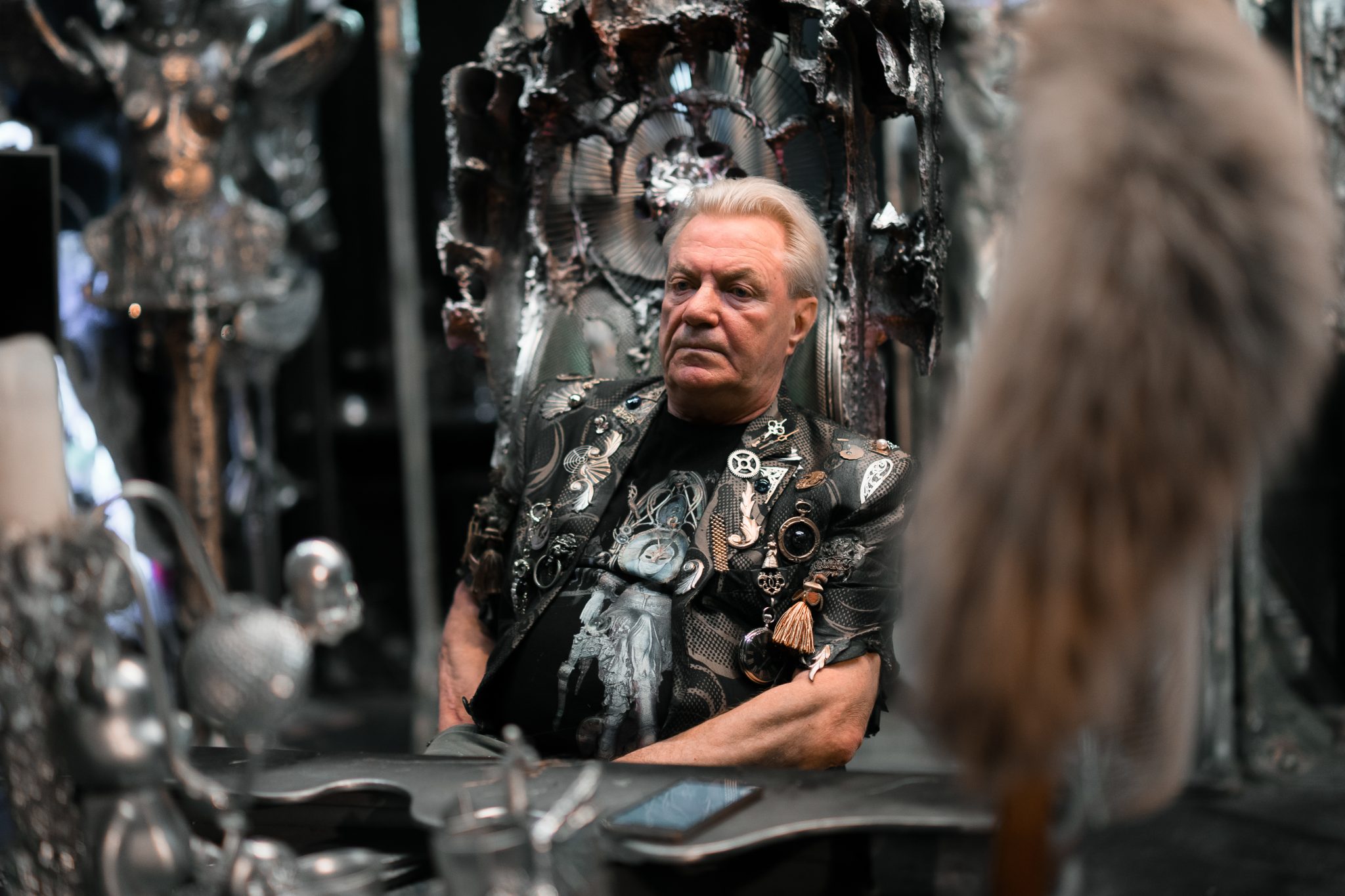 Художник встретил нас в своей мастерской, которая буквально пропитана таинственностью. Приглушенный свет и силуэты прекрасных дам создают атмосферу сказочного мира, а сам скульптор превращается в героя волшебной истории.