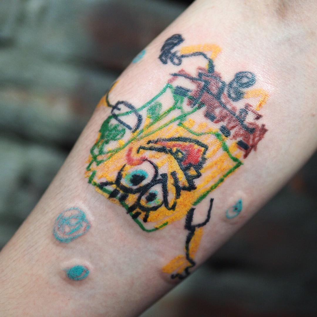 Впрочем, нельзя сказать, что творчество Боны исключительно примитивистское (я бы отнесла ее эскизы скорее к неоэкспрессионизму). Отказавшись от традиционной контурности в татуировке, в выбранной манере она создает и портреты, и сюжетные картины, умело совмещая технику быстрого наброска с реалистичной цветовой проработкой, а также и вовсе объединяя в одной работе разную стилистику. Это лишь подтверждает известное мнение, что творческому человеку тесно в рамках одного направления, как ребенку, которому скучно раскрашивать заданные в книжке контуры, и он намеренно нивелирует ценность реалистичного изображения дополнениями из цветных каракулей.