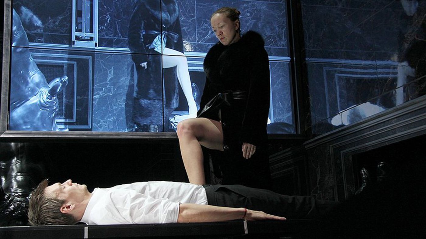 Кровь — вот одно из ключевых понятий той мистерии, которая и разыгрывается уже не один год на сцене МХТ. Кровь в этом действии вполне реальная. И страдальца Митю Карамазова в исполнении Филиппа Янковского ведут на казнь, а перед этим избивают до крови. И здесь всё разворачивается на уровне фола. Актёр, переживший рак, которому запрещены стрессы, играет так, что кровь превращается в настоящую, ибо