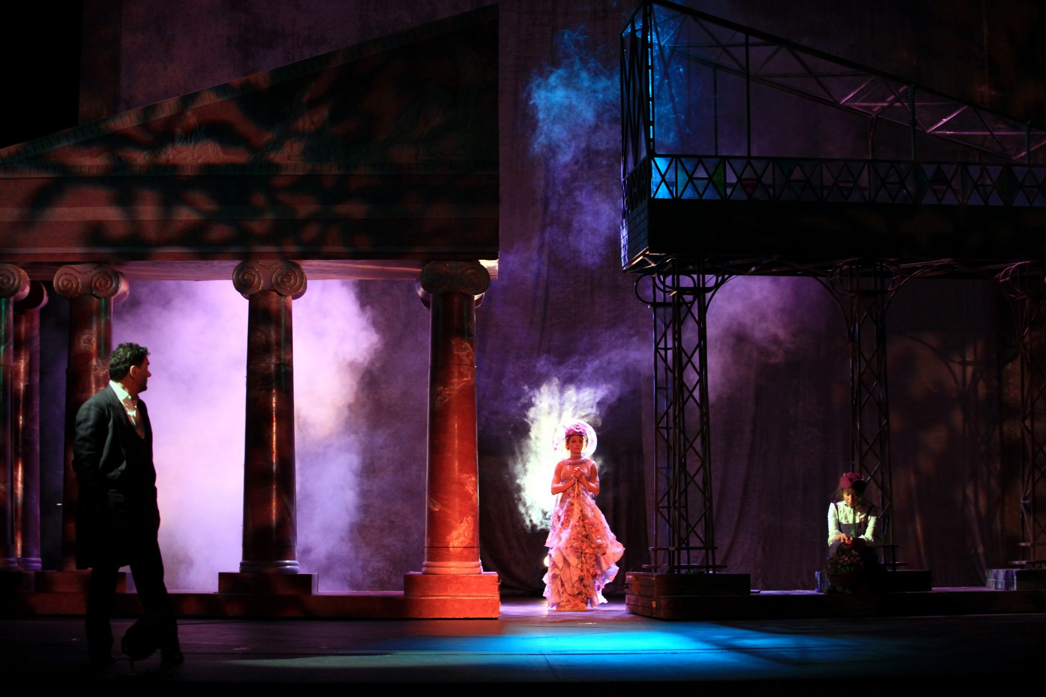 Однако меня заинтересовали декорации. Они здесь очень метафоричны — половину сцены занимает часть фасада уличного здания с железными колоннами, а другую — фрагмент древнегреческого храма. Символы низшего и высшего общества. В дальнейшем, когда Элиза завершает свое обучение, первую декорацию увозят, оставляя до конца спектакля только вторую. Вывод напрашивается сам. Решение действительно нетипичное, но для формирования впечатления от спектакля этого мало. Не ради декораций же все делается.