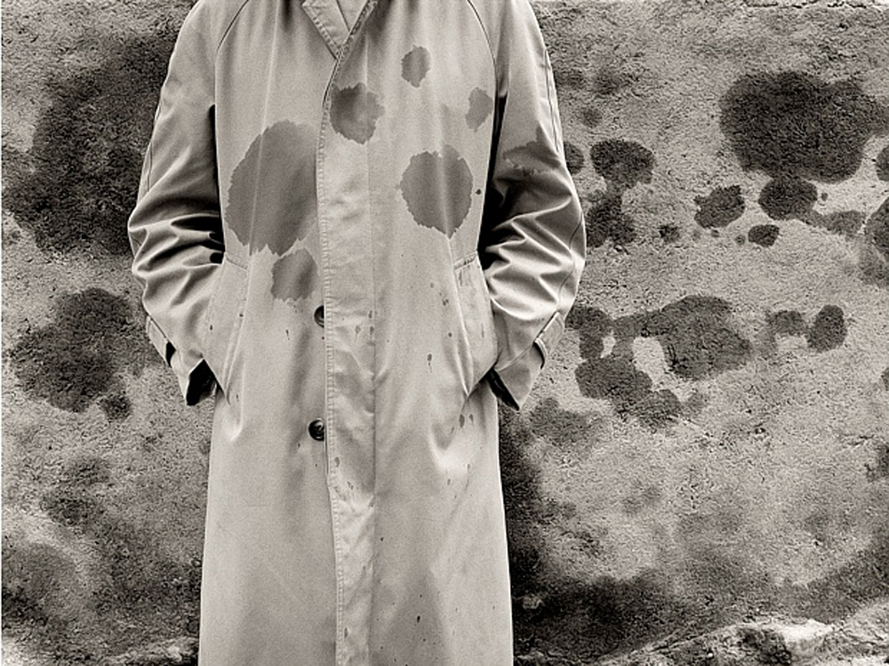 На фото мы видим парня, одетого в плащ с огромными пятнами. А за его спиной находится стена с похожими разводами, которая визуально является продолжением этого плаща. Руки молодого человека в карманах, а лицо полностью обрезано, чтобы фотография не походила на портретную фотосъемку. Автор хочет показать зрителю возникновение иронии в повседневных вещах.